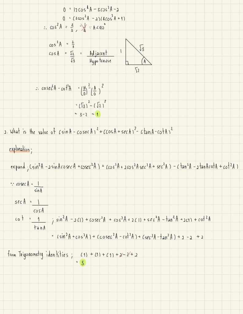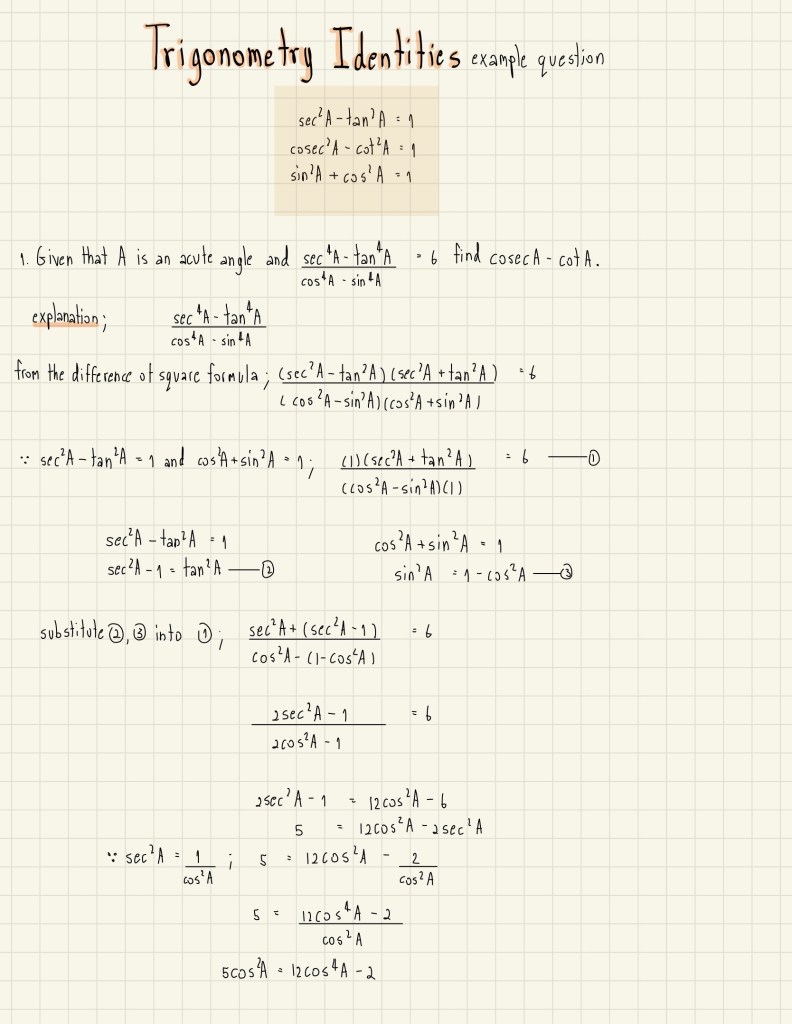 Trigonometry Identities are equalities that involve trigonometry function.These function involve curtain function of 1or more to anThe distinct of trigonometry identities can involve angle or side length of a triangle. To solve the trigonometry identity function the function need to be first simplified and for the second step the common method is to use the substitution rule and then simplifying the answer. All trigonometry identities function are based on the 6 trigonometry ratio which is sine, cosine, tangent, cosecant, secant and cotangent. All fundamental trigonometry identities is based on the right triangle such as adjacent side, hypothenuse side and opposite side.